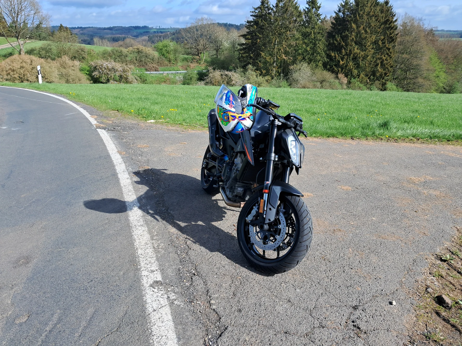 Der Morgen begann klar und vielversprechend: Um 08:45 Uhr verließ ich Wesseling, die KTM Duke bereit für einen Tag voller Kurven, Landschaft und Gedanken. Die Strecke führte mich zunächst über die A553 und A1 bis zur Abfahrt Wisskirchen. Navi-App „Amigo“ auf kurvenreich gestellt, Kamera montiert – die Tour konnte beginnen.